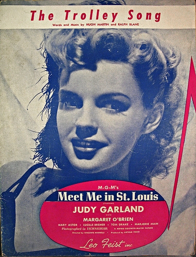 The Trolley Song – Meet Me in St. Louis– Judy Garland With her high starched collar and her high topped shoes And her hair piled high upon her head She went to find a jolly hour on the trolley And she found my heart instead With my light brown derby and my bright green tie I was quite the lonesomest of men I started to yen so I counted to ten Then I counted to ten again Clang, clang, clang went the trolley Ding, ding, ding went the bell Zing, zing, zing went my heart strings For the moment I saw her I fell Chug, chug, chug went the motor Thump, thump, thump went the brake Thump, thump, thump went my heart strings When she smiled I could feel the car shake I tipped my hat, I took a seat I said I hoped I hadn’t stepped upon her feet “Say, what’s your name?”, I lost my breath She looked so lovely that it scared me half to death Oh, buzz, buzz, buzz went the buzzer Pop, pop, pop went the wheels Stop, stop, stop went my heart strings As she started to go then I started to know how it feels When the universe reels I tipped my hat, I took a seat I said I hoped I hadn’t stepped upon her feet I asked her name, then lost my breath She looked so lovely that it scared me half to death Oh, buzz, buzz, buzz went the buzzer Pop, pop, pop went the wheels Stop, stop, stop went my heart strings As she started to leave I took hold of her sleeve with my hand And as if it were planned She stayed on with me and it was grand just to stand With her hand holding mine to the end of the line End of the line The end of the line | トローリー・ソング – (セント・ルイスで会いましょう) (邦題:若草の頃) – ジュディ・ガーランド彼女の高くノリづけされた襟と ハイトップの靴 髪の毛は高く束ねられいる 頭の上のところで 彼女は楽しみの時間を見つけたいのさ トローリーに乗って そして、そのかわりに私の心を見つけた 私の淡い茶色の山高帽と 私の鮮やかな緑色のネクタイ 私は寂しがりの男なのさ 憧れるようになったよ だから、10まで数えて もう一度10まで数えたんだ カラン、カラン、カラン トローリーが行った ジャン、ジャン、ジャン ベルを鳴らしながら ビュン、ビュン、ビュン 私の心がつながった 彼女を見た瞬間に、 私は落ちたのさ ポッ、ポッ、ポッ モーターが動いて ガン、ガン、ガン ブレーキが鳴る ガン、ガン、ガン 私の心はつながったのさ 彼女が微笑んだ時に 車両が震えたのを感じたよ 私は帽子を脱いで 席についた 私は言ったよ、願わくば 彼女の足を踏んでない事を願うって “ねえ、あなたのお名前は?” 私は呼吸を忘れてしまった 彼女は本当に可愛くて 私を半ば死ぬことを恐れさせるんだ オー、ブン、ブン、ブン ブザーが鳴った ポッ、ポッ、ポッ 車輪が行くよ 止めて、止めて、止めて 私の心はつながったのさ 彼女が行ってしまう時 私はどう思うのかを感じ始めたのさ 宇宙がグルグル回ることが 私は帽子を脱いで 席についた 私は言ったよ、願わくば 彼女の足を踏んでない事を願うって “ねえ、あなたのお名前は?” 私は呼吸を忘れてしまった 彼女は本当に可愛くて 私を半ば死ぬことを恐れさせるんだ オー、ブン、ブン、ブン ブザーが鳴った ポッ、ポッ、ポッ 車輪が行くよ 止めて、止めて、止めて 私の心はつながったのさ 彼女が行ってしまう時 彼女の袖を掴んだんだ 私の手でね そして、思っていた通りに 彼女は私と留まったのさ それはただ立っているだけの地面さ* 彼女の手が私の手を掴んでいると この線路の終点まで この線路の終点 この線路の終点まで |